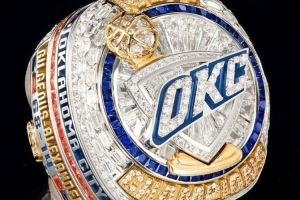 采用14K白金与黄金打造,镶嵌蓝橙双色蓝宝石。每枚戒指均以钻石镶嵌球员号码。