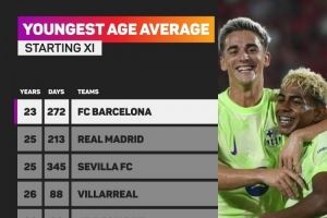 体育资讯8月20日讯 Opta统计了西甲首轮比赛各队首发球员的平均年龄,并列出最年轻榜单,巴萨23岁272天居首,皇马25岁213天次席。